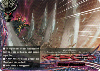 Brutal Disaster! is the Deep Impact and now I'm certain that Deep should be played Sieger-style. You can only cast it when your opponent has less than 4 life and if you have a Size 3 monster on the field. Pay 1 gauge, discard 2 Deep cards and deal straight-up 4 damage to the face. Hey, that's awfully affordable. Sure, technically 1 gauge and 2 cards from hand is more expensive than 4 gauge (by 0.5 advantage). But realistically speaking, it's much easier to get 2 cards in hand (3 including Brutal Disaster) than to have 4 clean gauge just sitting there. In fact, Brutal Disaster is great because you can Accel End into Death Astray from no gauge and no cards in hand and pull the Impact off. It's a great finisher and very realistically achievable, making Deep a viable way to build DDW.