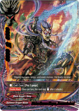 Deep starts off with a huge triple-rare Size 3, Death Tallica. Thank goodness that it can't ever get Soulguard (from Ultimate Buddy) because getting a theoretically unlimited amount of soul on-play is pretty scary. Note that it sends all Deep cards, including spells, into this card's soul. Death Tallica's effect is essentially Soulguard except instead of paying 1 card, you pay 3. That explains the super soul ramp, but is it worth it? The short answer is no, but with the right support Death Tallica can easily get 12 or more cards from your drop zone into the soul. That's equivalent to 4 Soulguards which simply rocks. Alongside all the Size 0 support, Death Tallica is Darkness Dragon World's pseudo-Sieger and fits it pretty well. 10000 power is nothing to scoff at, and his special pseudo-Soulguard prevents damage from Spectral Strike, Penetrate, and other on-kill effects.