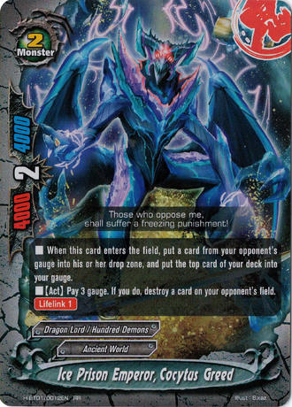 Alongside the new Raging Spirits, H-BT01 gave us a bit more support for the early-mid game of Dragon Lords. Ice Prison Emperor, Cocytus Greed (is this Vanguard now?) is an early-play Size 2 that allows you to "steal" 1 gauge from your opponent - basically casting Dimensional Demon Slay Slash. That's basically a +1, so Cocytus is a great card, especially if you negate the Lifelink with Dragonverse. His second ability is situational because, like Gan Alchimia, there is no "may" clause which allows your opponent to play around it. However, it's a cheaper ability than Gan Alchimia's and it allows Ancient World to spot remove some nasty weapons, giving them an out against early weapon-aggro decks.